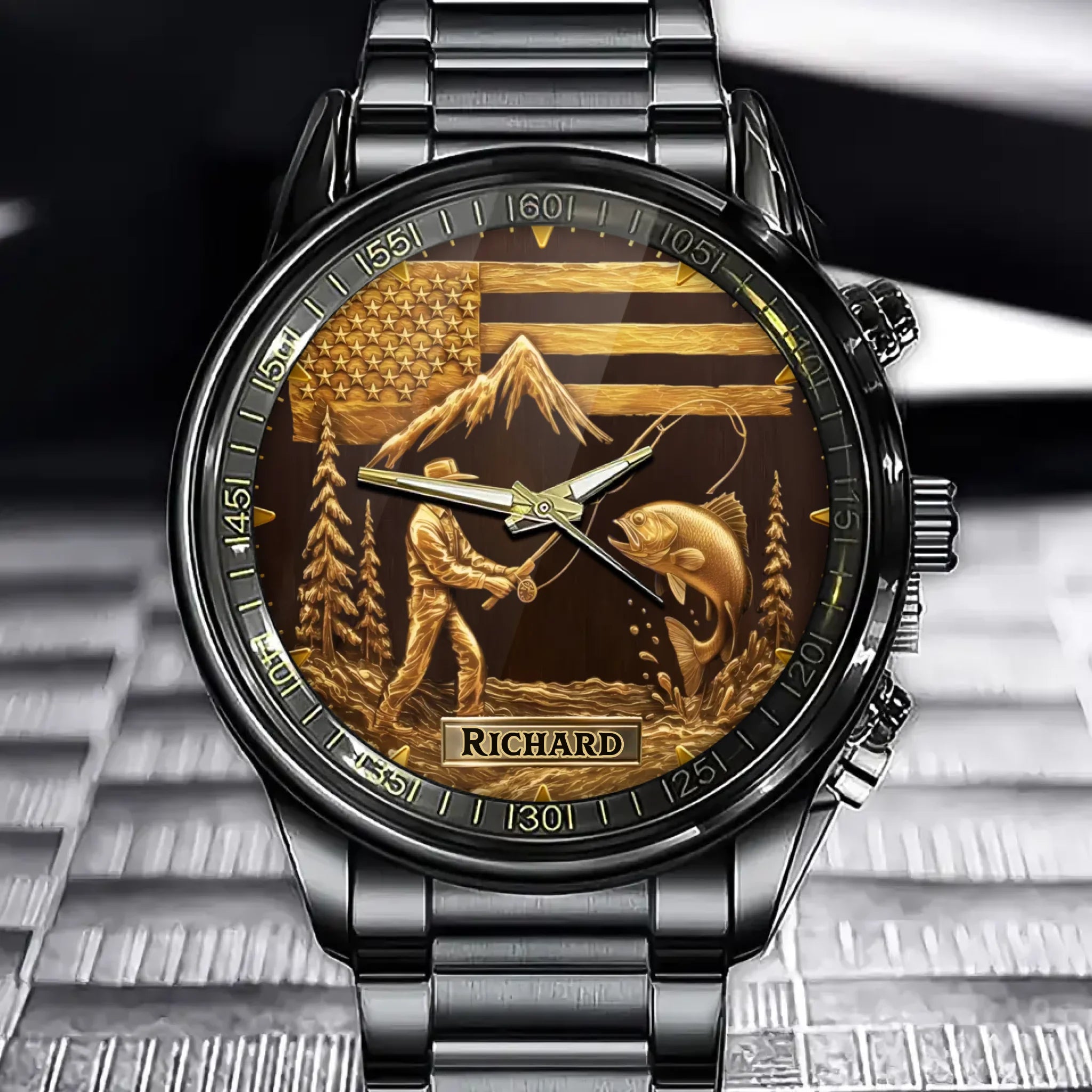 Personalized Golden Fishing Adventure Watch – Custom Name & Mountain Design