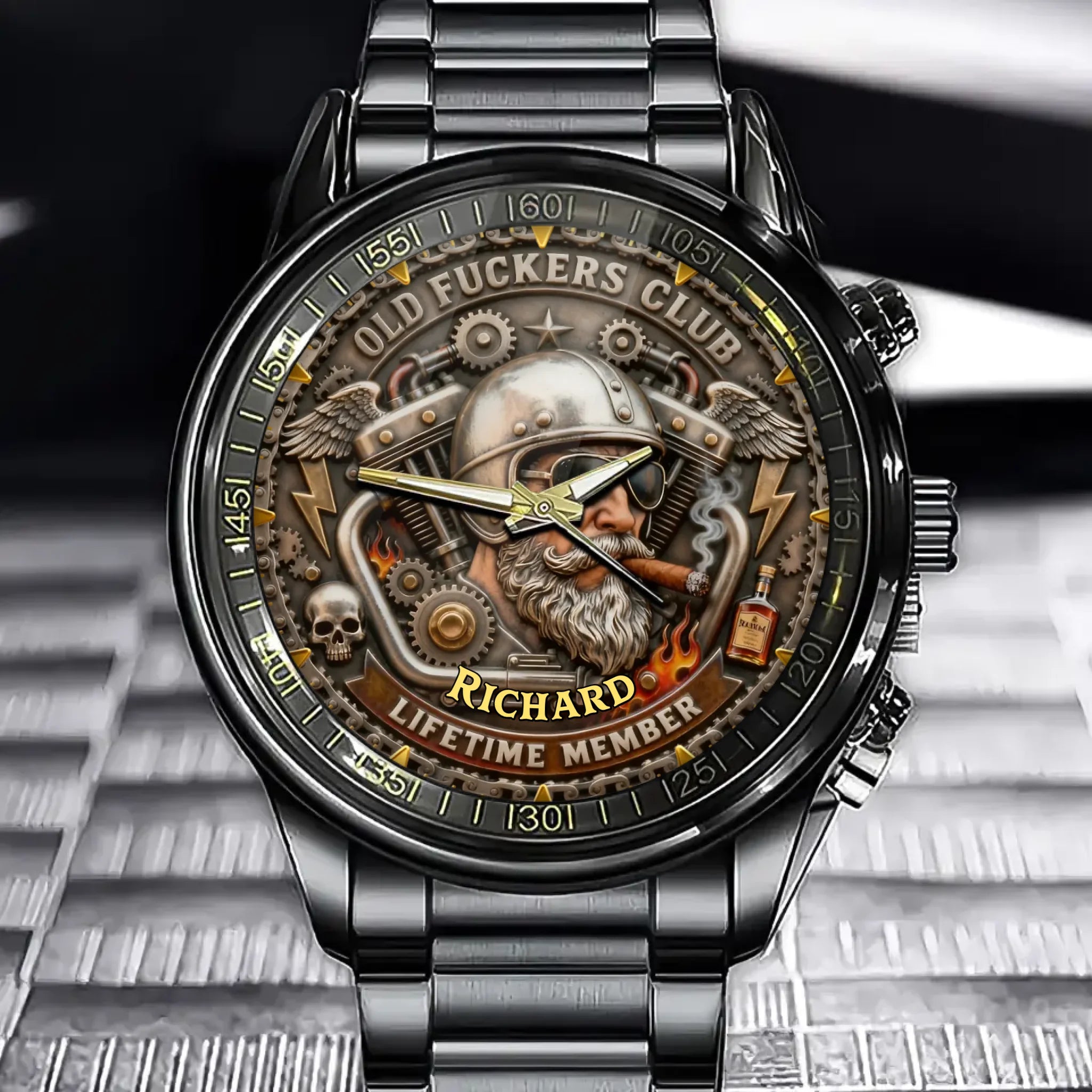 Personalized Old Fuckers Club Watch - Biker Helmet & Gear Theme with Custom Name Option