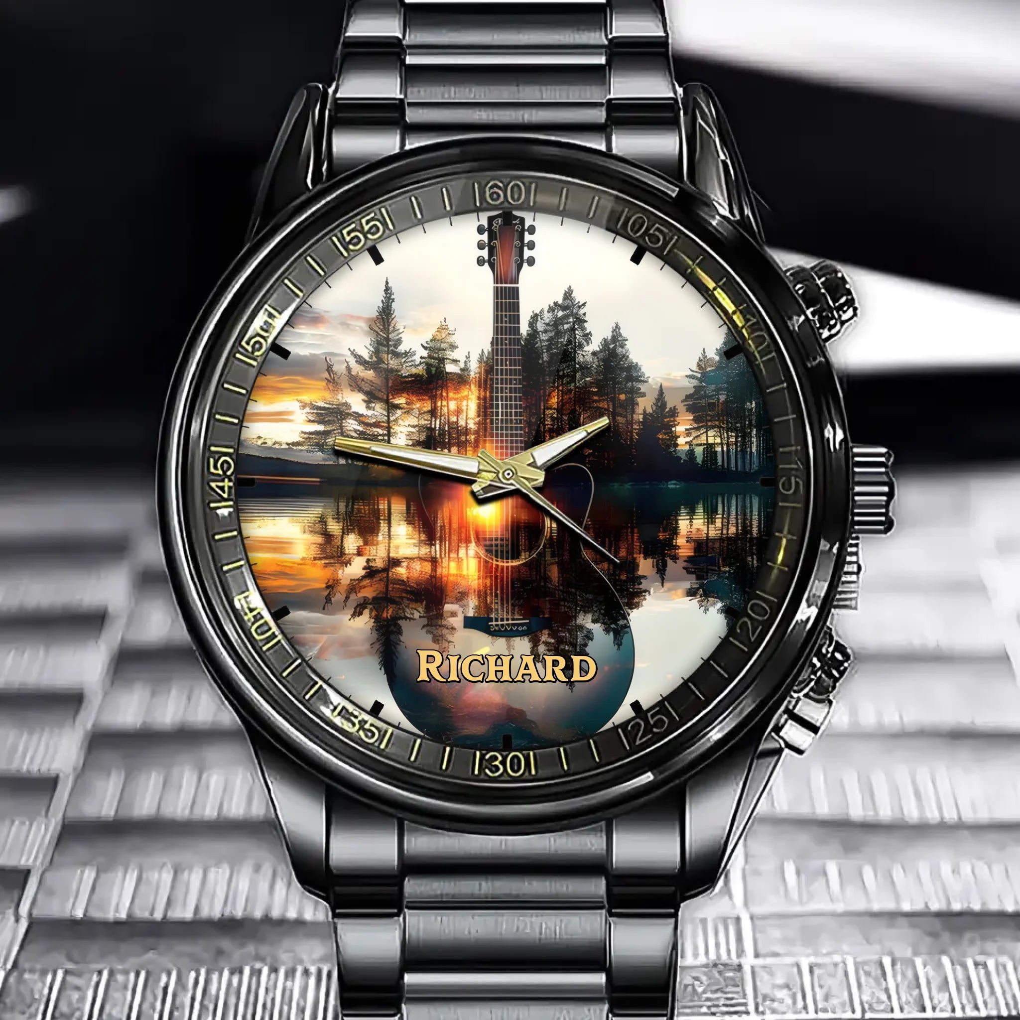 Personalized Sunset Reflection Guitar Watch - Add Your Name for a Timeless Design